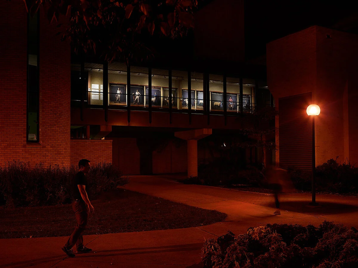 Concordia College invited me recently to be a visiting artist, complete with a series of lighting workshops for undergrad photo students, an exhibition of nine works, and an artist talk. I also made it my “unofficial book reveal” as well as a short documentary series I’ve been working on for the last year. Three participants from The Unchosen Ones project: Kenzi, Rylie, and Louis, stood up with a round of applause during my talk. I was proud to see them in the audience, along with their significant others. I brought the same backdrop and lighting equipment used for the series whiling indulging students in the nuances of how to “hide your main light with your fill” as well as other technicals.